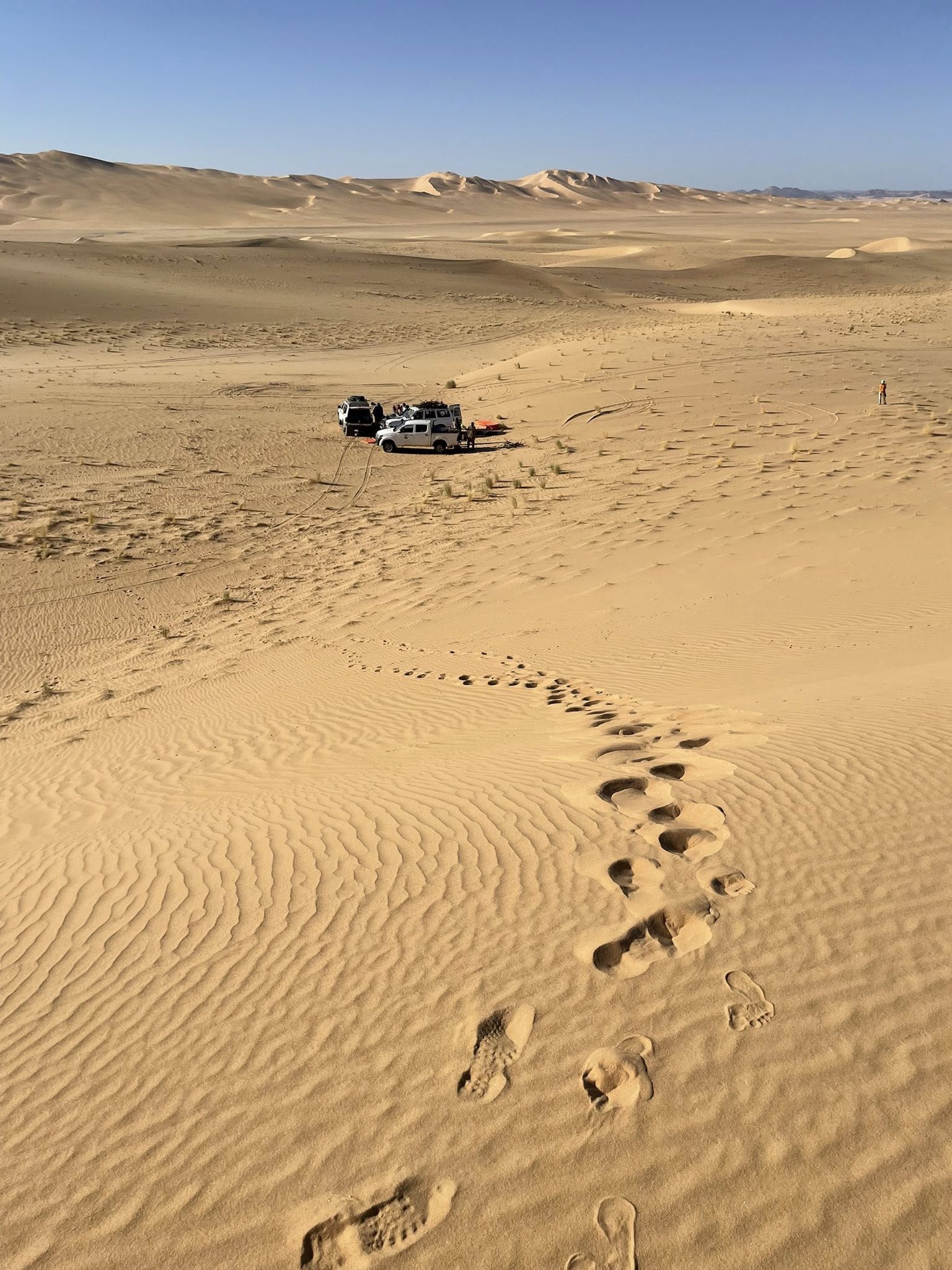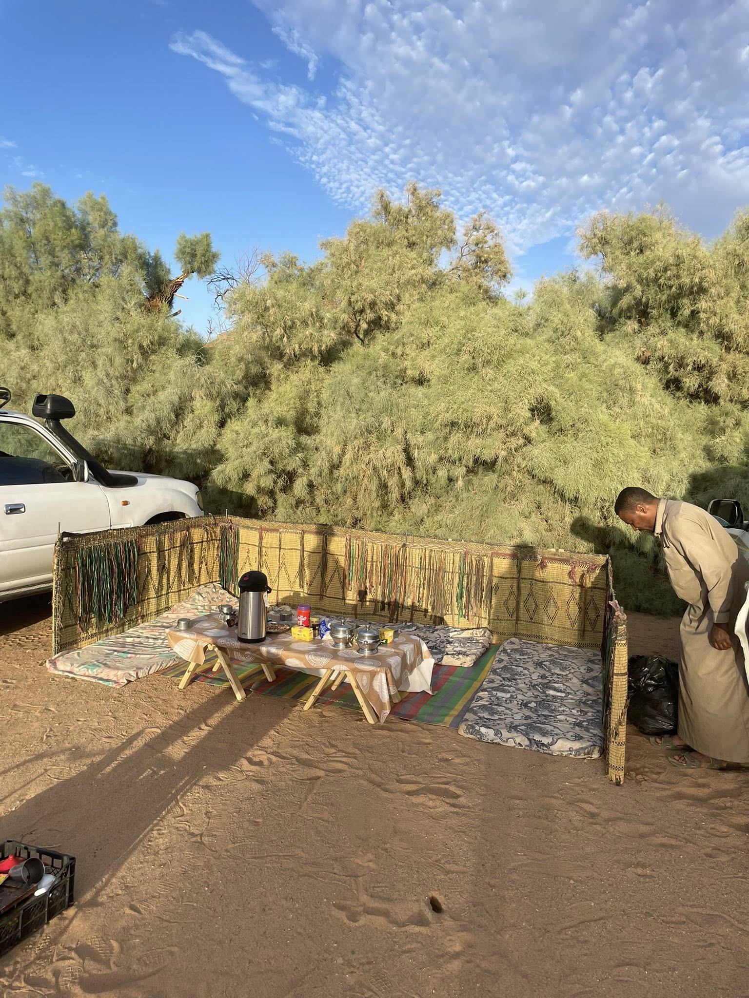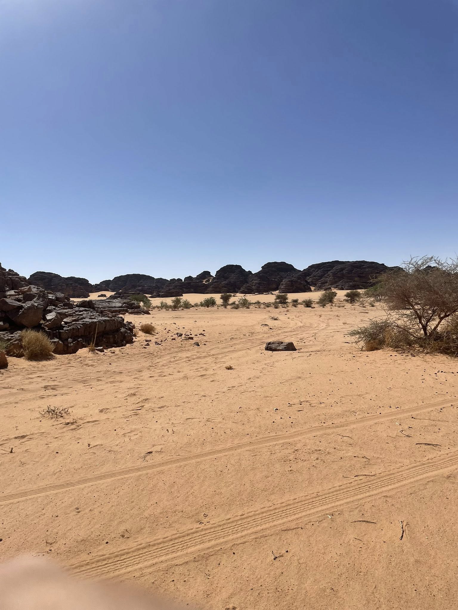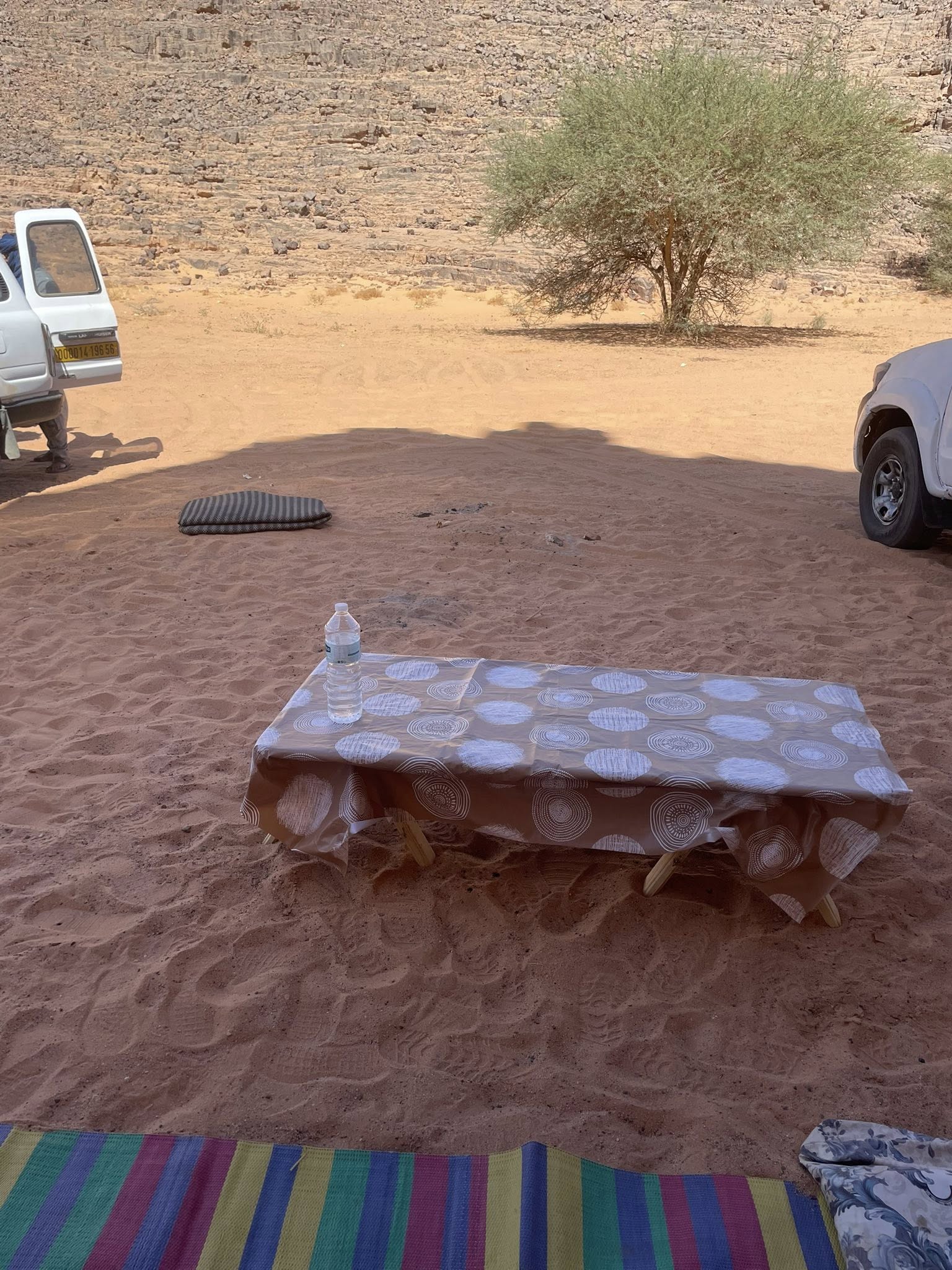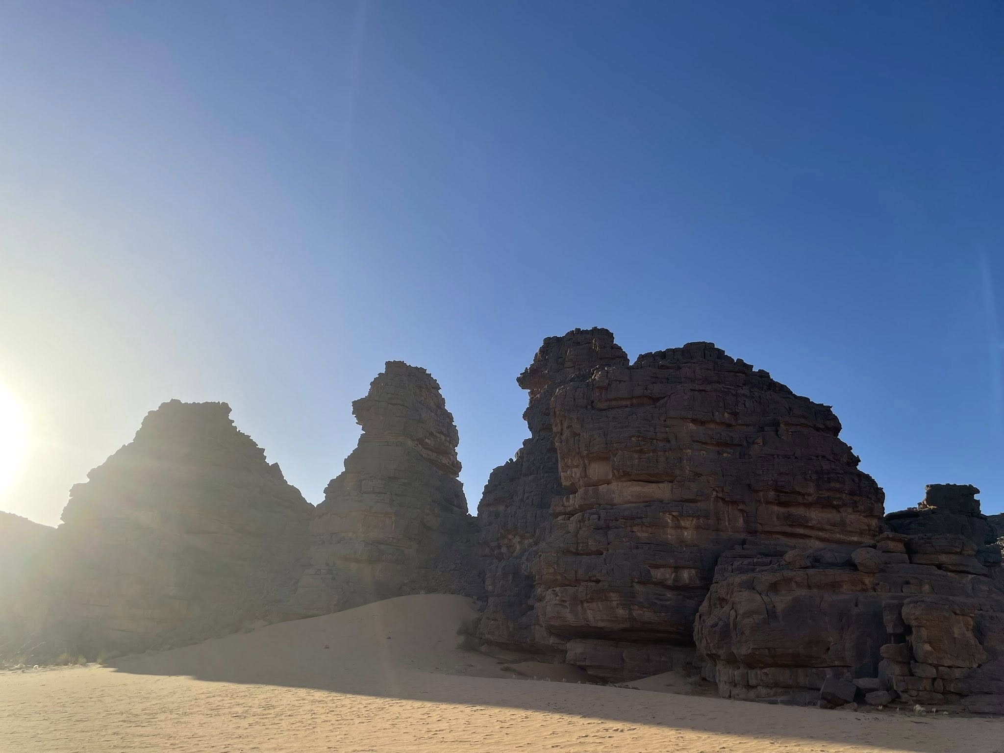 S’achève la nuit, et déjà l’air sec et doux de Djanet nous enveloppe. L’équipe des chauffeurs touarègue nous accueille et bientôt, nos premiers pas s’enfoncent dans le désert. Le campement est dressé au cœur du désert. Ca était une surprise pour moi de me retrouver tout de suite à dormir sur le sable en descendant de l’avion. Mais ça a été déjà une sortie de zone de confort.